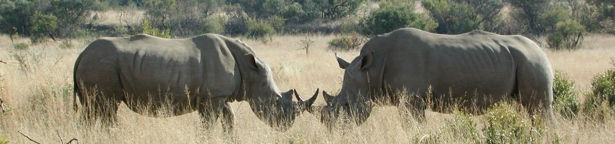 Two southern white rhinos in Pilanesburg National Park, South Africa.